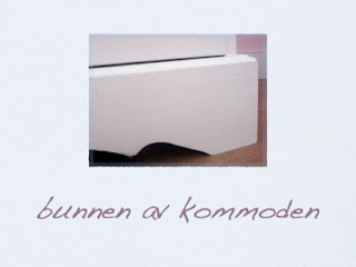 Sokkelen på kommoden består av en planke som jeg ikke husker målene på her og nå. I planken har jeg frest ut en profil på den øvre kanten og de andre utskjæringene ble gjort med stikksag av min kjære pappa. Er litt pysete med enkelte verktøy ;) Deretter var det bare å spikre på sokkelen.